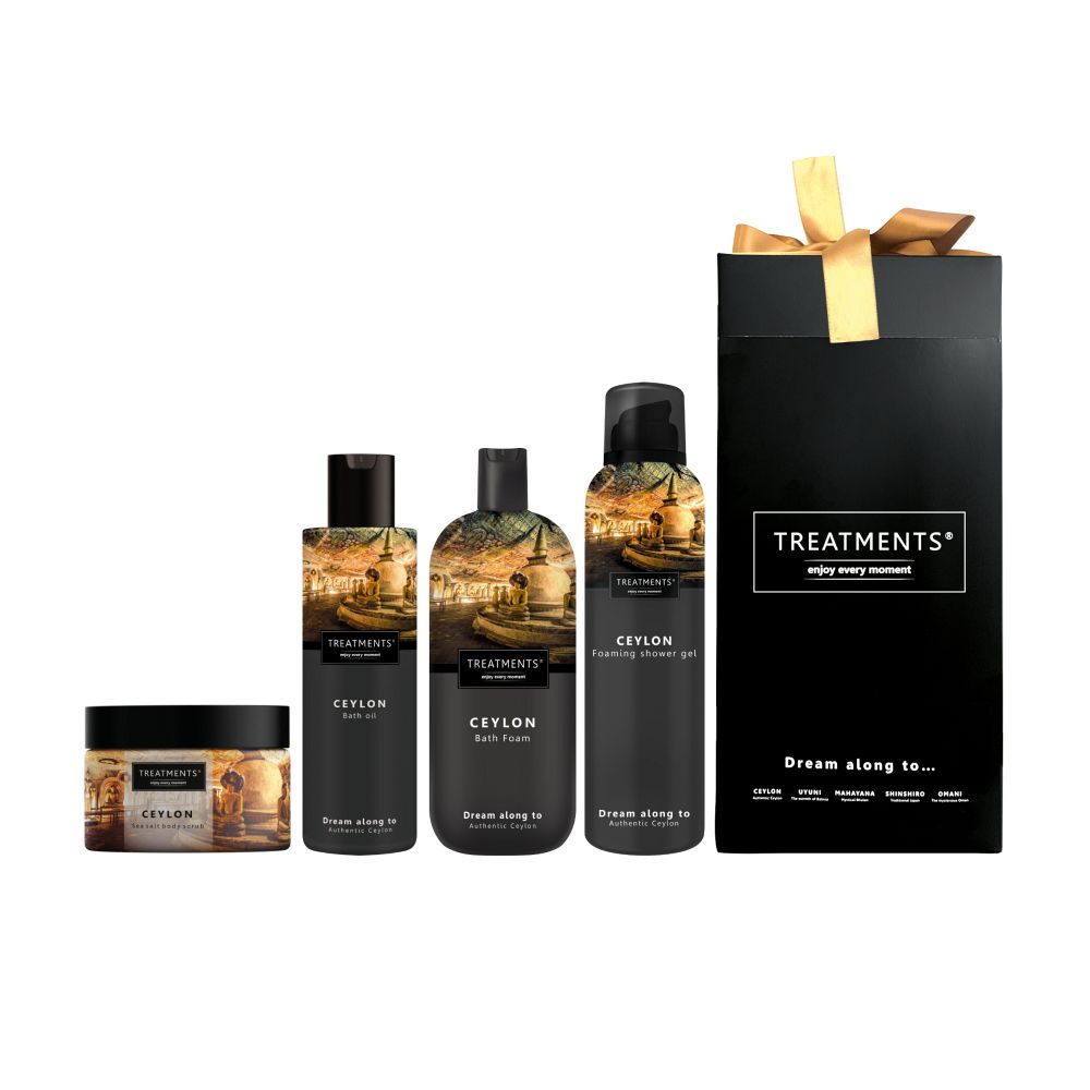 Dárková sada kosmetiky značky Treatments® v elegantní krabičce s mašličkou. Sada obsahuje sprchovou pěnu 200 ml, pěnu do koupele 500 ml, olej do koupele 150 mla tělový peeling s mořskou solí 400 g. Vůně Ceylon. Rozměry: 14 x 14 x 28 cm.
