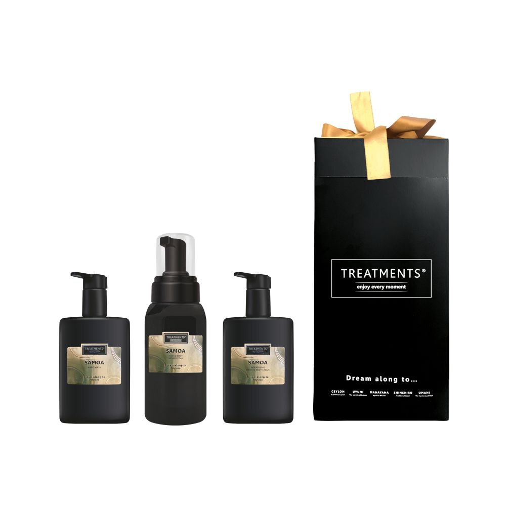 Luxusní dárková sada kosmetiky s vůní Samoa značky Treatments® v elegantní krabičce s mašličkou. Sada obsahuje tekuté mýdlo na ruce 200 ml, sprchovou pěnu na vlasy a tělo 250 ml a tělový krém 200 ml. Rozměry: 14 x 14 x 28 cm.