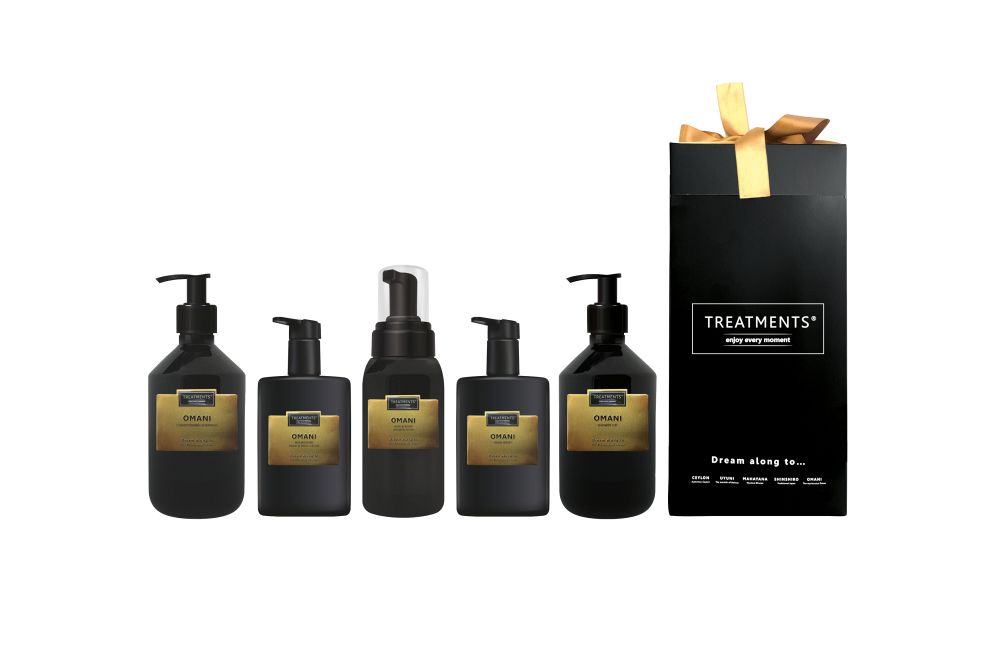 Luxusní dárková sada kosmetiky s vůní Omani značky Treatments® v elegantní krabičce s mašličkou. Sada obsahuje šampon obsahujicí kondicioner 300 ml, krém na ruce i tělo 200 ml, sprchovou pěnu na tělo a vlasy 250 ml, tekuté mýdlo na ruce 200 ml a sprchový gel 300 ml. Rozměry: 14 x 14 x 45 cm.