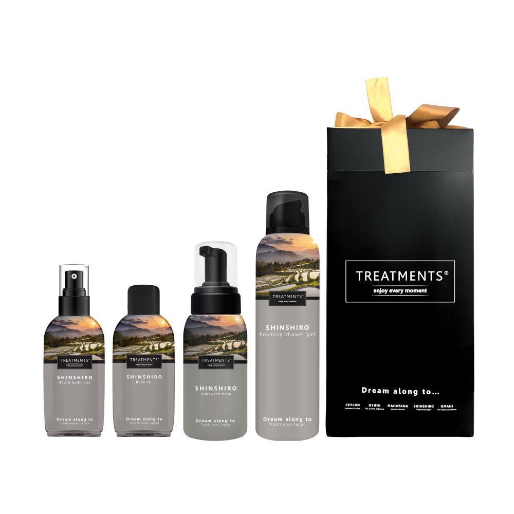 Dárková sada kosmetiky značky Treatments® v elegantní krabičce s mašličkou. Sada obsahuje menší balení tělového oleje 50 ml, osvěžujicí relaxační mlhu ve spreji na tělo nebo polštář 50 ml, sprchovou pěnu 200 ml a pěnové mýdlo na ruce 250 ml. Vůně Shinshiro. Rozměry: 14 x 14 x 28 cm.