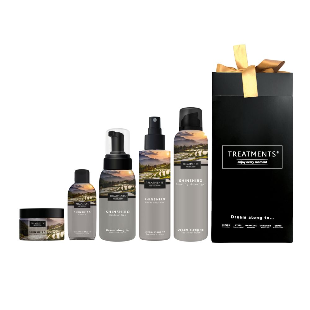 Dárková sada kosmetiky značky Treatments® v elegantní krabičce s mašličkou. Sada obsahuje menší balení tělového oleje 50 ml, osvěžujicí relaxační mlhu ve spreji na tělo nebo polštář 150 ml, sprchovou pěnu 200 ml, pěnové mýdlo na ruce 250 ml a tělový peeling s mořskou solí 400 g. Vůně Shinshiro. Rozměry: 14 x 14 x 28 cm.