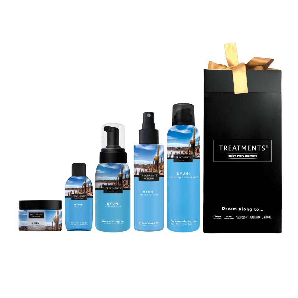 Dárková sada kosmetiky značky Treatments® v elegantní krabičce s mašličkou. Sada obsahuje menší balení tělového oleje 50 ml, osvěžujicí relaxační mlhu ve spreji na tělo nebo polštář 150 ml, sprchovou pěnu 200 ml, pěnové mýdlo na ruce 250 ml a tělový peeling s mořskou solí 400 g. Vůně Uyuni. Rozměry: 14 x 14 x 28 cm.