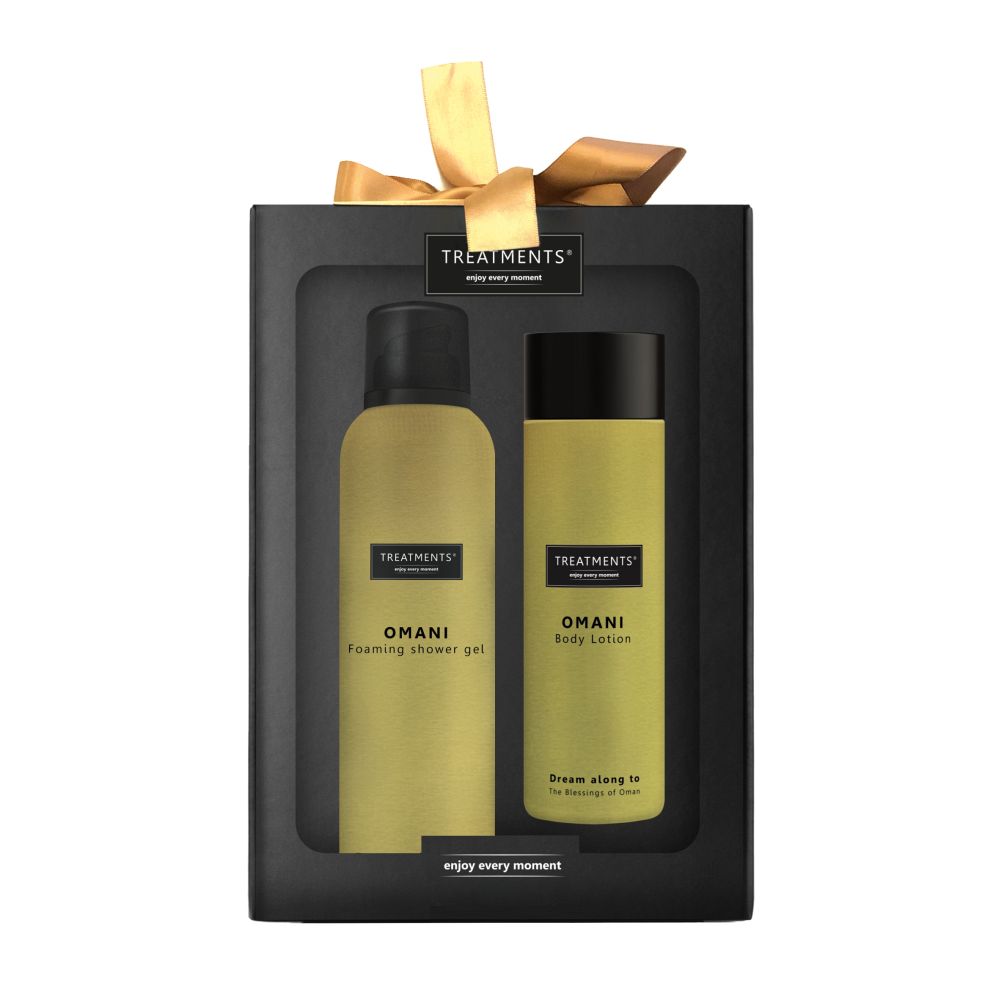 Dárková sada luxusní kosmetiky značky Treatments® v elegantní krabičce s mašličkou. Sada obsahuje sprchovou pěnu a tělové mléko. Vůně Omani. Rozměry: 5,5 x 15 x 25,5 cm.