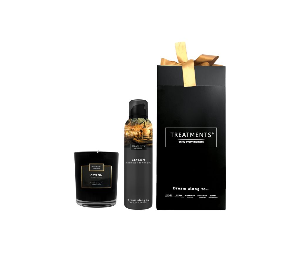 Dárková sada kosmetiky značky Treatments® v elegantní krabičce s mašličkou. Sada obsahuje sprchovou pěnu a vonnou svíčku. Vůně Ceylon. Rozměry: 14 x 14 x 28 cm.
