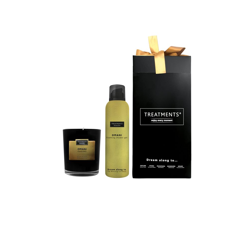 Dárková sada luxusní kosmetiky značky Treatments® v elegantní krabičce s mašličkou. Sada obsahuje sprchovou pěnu a vonnou svíčku. Vůně Omani. Rozměry: 14 x 14 x 28 cm.