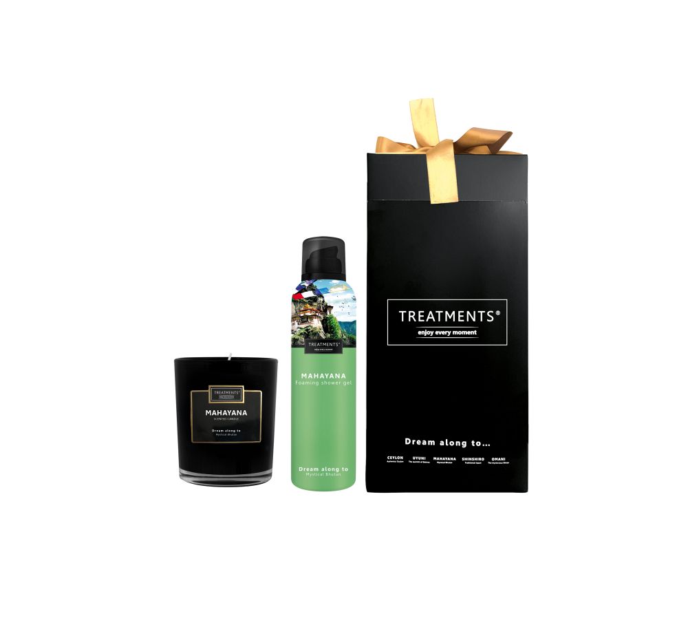 Dárková sada kosmetiky značky Treatments® v elegantní krabičce s mašličkou. Sada obsahuje sprchovou pěnu a vonnou svíčku. Vůně Mahayana. Rozměry: 14 x 14 x 28 cm.