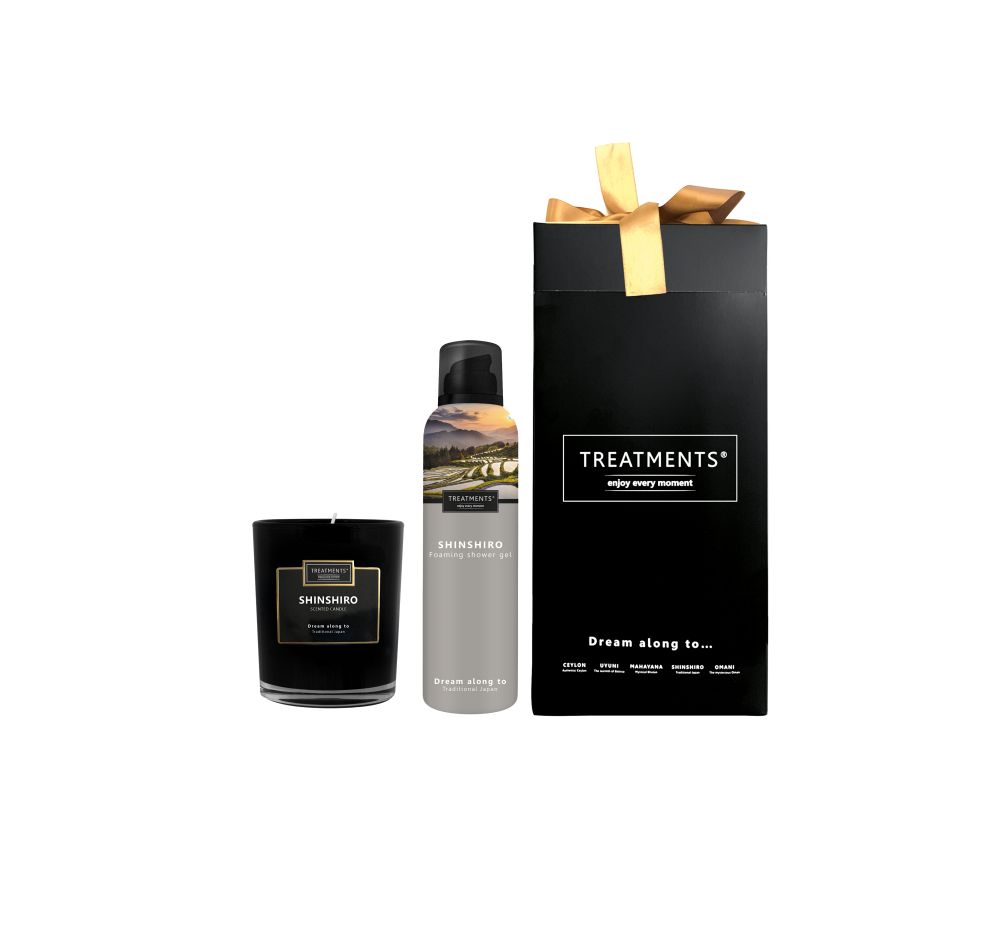 Dárková sada kosmetiky značky Treatments® v elegantní krabičce s mašličkou. Sada obsahuje sprchovou pěnu a vonnou svíčku. Vůně Shinshiro. Rozměry: 14 x 14 x 28 cm.