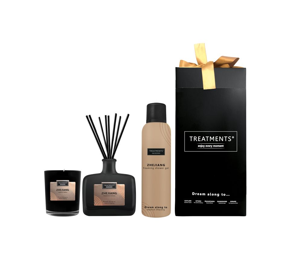 Luxusní dárková sada s vůní Zhejiang značky Treatments® v elegantní krabičce s mašličkou. Sada obsahuje sprchovou pěnu, vonnou svíčku a difuzér. Rozměry: 14 x 14 x 45 cm.