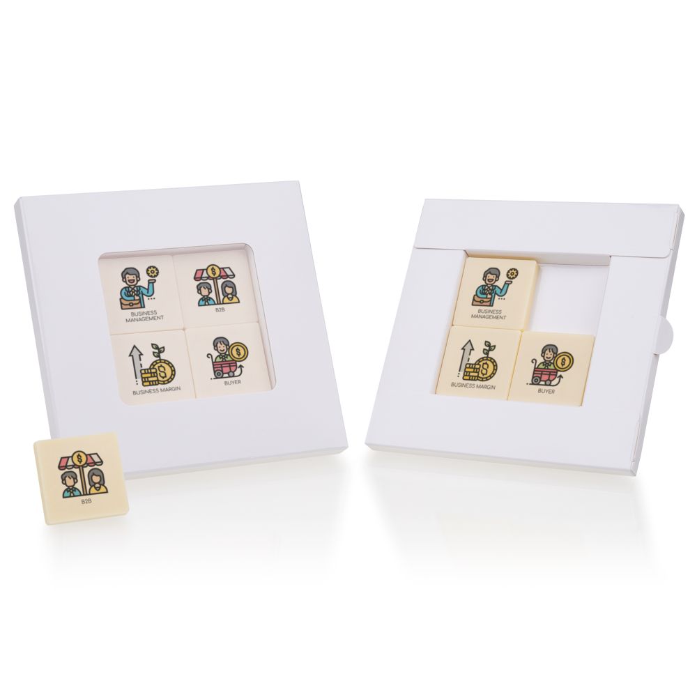 Jedná se o výrobu reklamní čokoládových puzzles. Bílá čokoláda s vlastním potiskem jedlými barvami. Standardně dodáváno v bílé papírové krabičce s plastovým víčkem. Puzzles jsou skládány v sadách po 4,6,12 ks. K ceně je nutné připočítat grafické zpracování a tiskovou přípravu, které se odvijí od druhu a velikosti potisku. Pro bližší kalkulace prosím kontaktujte náš obchodní tým. Minimální trvanlivost 12 měsíců. Dodání 20 pracovních dní pro zakázky do 1000 sad. Doporučená technologie tisku: komplimentka nebo samolepka Minimum pro objednávku: 100 sad