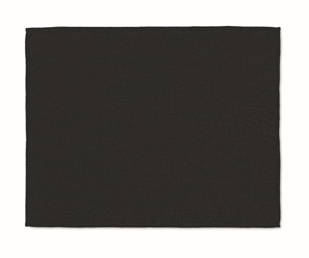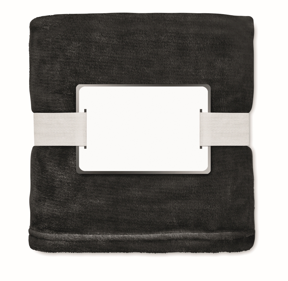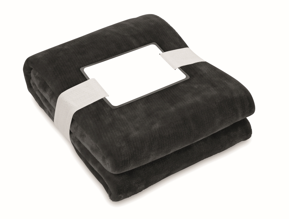 Fleecová deka RPET o gramáži 280 gr/m2, přebalená stuhou s kartičkou pro potisk. Rozměry: 120 x 150 cm. Materiál: RPET