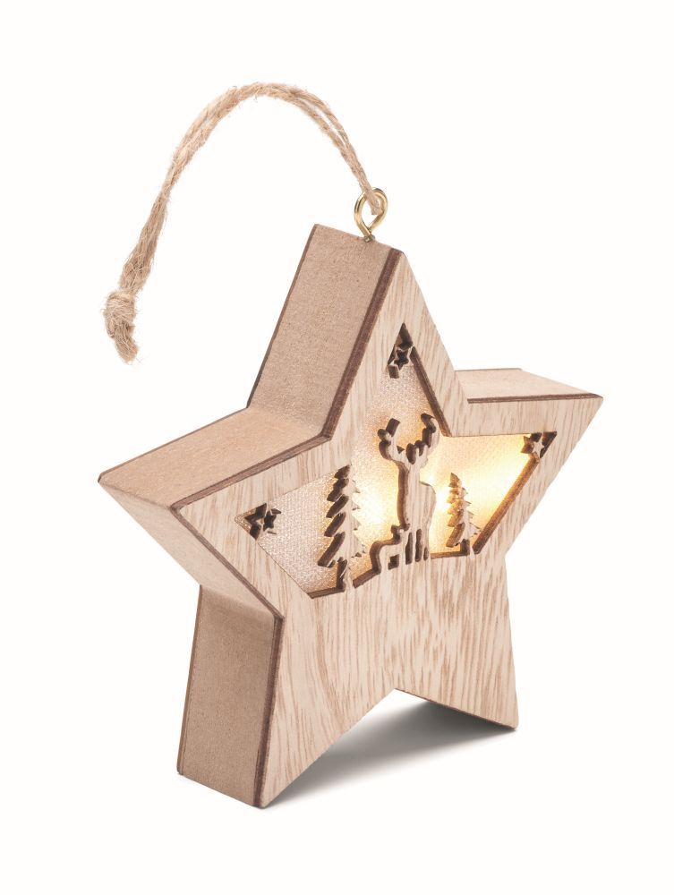Dekorační hvězda z MDF s vánočními motivy a se světlem uvnitř. Šňůrka na zavěšení. Včetně 3 baterií LR44. Rozměry: 10,6x10,6x2,5cm