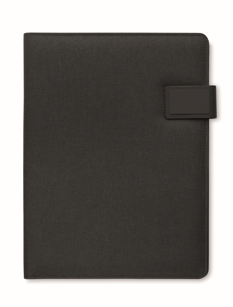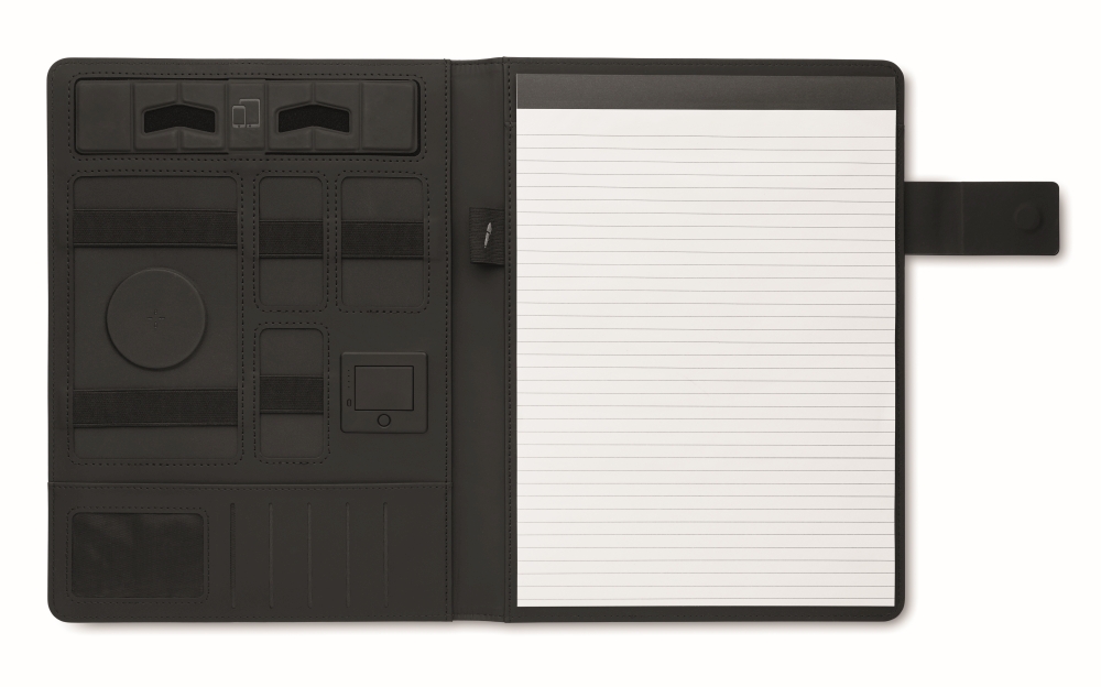 Konferenční složka A4 s plátěným PU obalem. Powerbanka 5000 mAh a 15W magnetická bezdrátová nabíječka. Poznámkový linkovaný blok, 20 listů. Vnitřních přihrádky. Magnetické zavírání. Elastický držák na pero. Rozměry: 23 x 31 x 2 cm