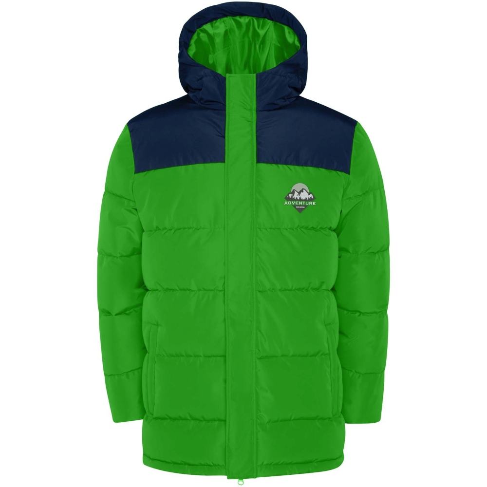 Polstrovaná bunda s kapucí. Přední zip krytý légou. Chránič brady. Dvě boční kapsy na zip. Elastické manžety.