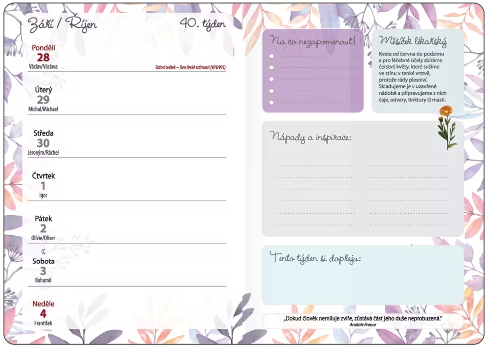 Elegantní barevný diář s popisem účinků a použití vybraných bylinek na každý měsíc, citátem na každý týden a prostorem pro poznámky, nápady a inspiraci. Desky jsou vyrobeny z matného lamina s oblíbeným hedvábným povrchem soft touch. Diáře jsou doplněny gumičkou přes hřbet, záložkou a třemi aršíky kreativních samolepek. Rozměry: 12,5 x 17,6 cm