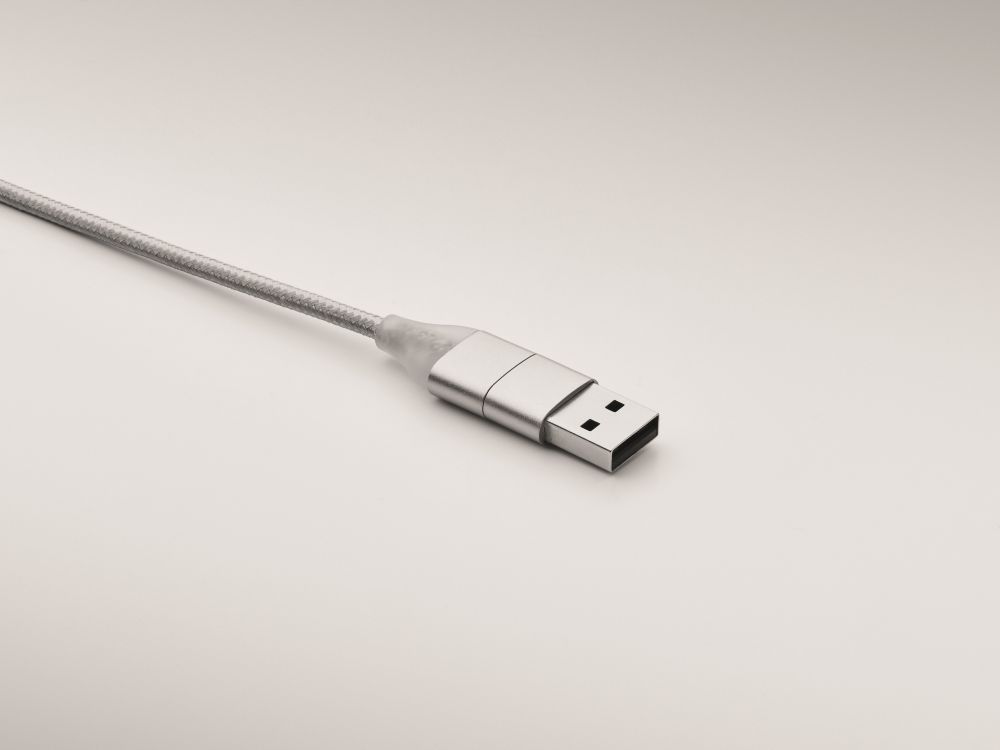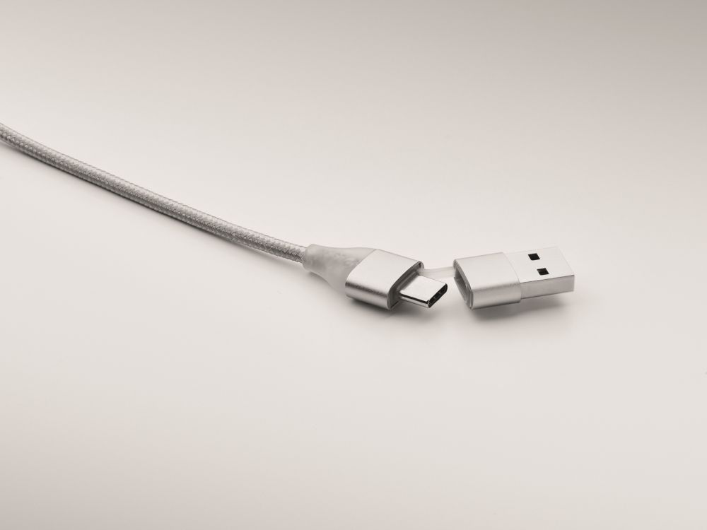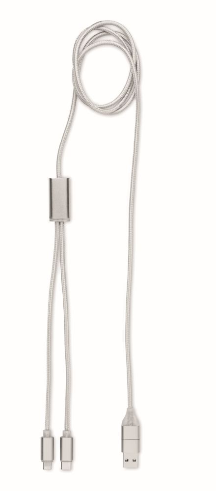 Nabíjecí kabel z hliníku. Vstup: 2v1 typ C a typ A a micro-B (2v1), výstup typ C a micro B. Délka kabelu: 120 cm. Rozměry: 120x1,7x0,8 cm