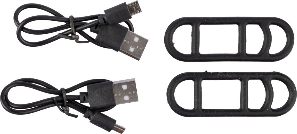 Sada dvou plastových silikonových světel na kolo se 3 LED světly a 4 režimy svícení. Kapacita baterie 650 mAh. Dodáváno v krabičce. Rozměry: 5 × 4,5 × 3 cm. Cena nezahrnuje recyklační poplatek.