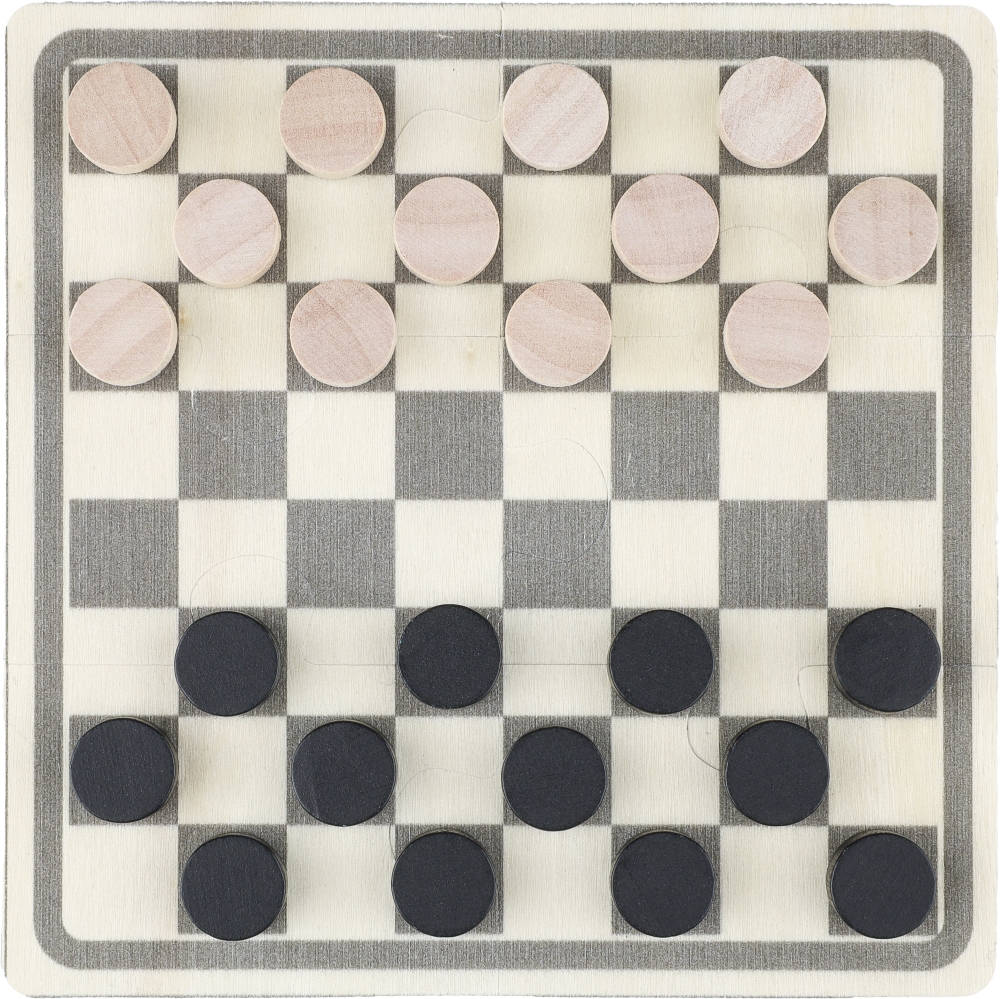 Dřevěná hra šachy a dáma v bavlněném sáčku se stahovací šňůrkou. Obsahuje 6dílné tištěné puzzle (černé/přírodní) k sestavení hrací plochy a 16 tištěných dřevěných žetonů v černé a přírodní barvě s potiskem šachových figurek. Obsahuje hrací návod. Hrací pole je vyrobeno z polywoodu a žetony z borovicového dřeva. Rozměry: 11,2 × 11,2 × 0,2 cm.