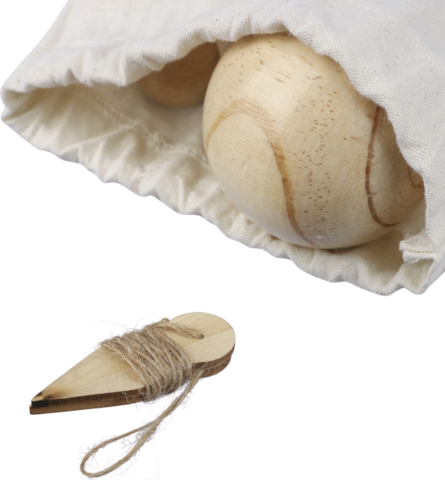 Dřevěná míčová hra, obsahující 6 míčů (každý 7 cm) a 1 menší míč (2 cm). Dodává se s provazem a je zabalen jako sada v bavlněném pouzdře se stahovací šňůrkou. Vhodné pro 4-6 hráčů a ideální pro aktivity založené na agility. Rozměry: 30 x 20 cm
