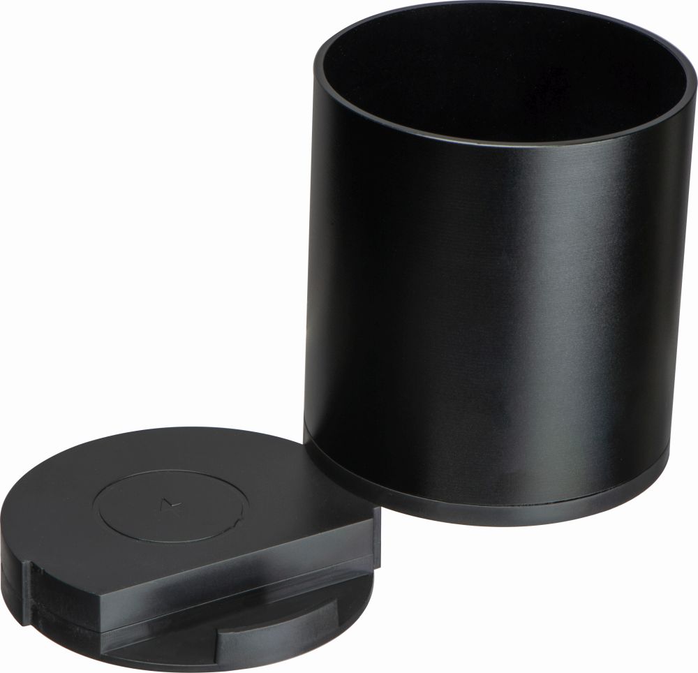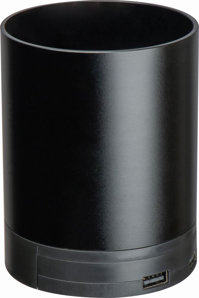 Stojánek na pera z recyklovaného hliníku s funkcí bezdrátového nabíjení s USB rozbočovačem (výkon 5 W). Součástí je nabíjecí kabel typu C. Rozměry: O 8,5 × 10,8 cm. Cena nezahrnuje recyklační poplatek.