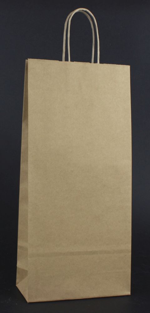 Přírodní taška na víno vyrobena z hnědého sulfátového papíru 120 g. Hnědá kroucená držadla. Doporučená technologie tisku: tampontisk T1, sítotisk S1. Maximální velikost tisku: 80 × 80 mm. Rozměry: 18 × 8 × 39 cm.