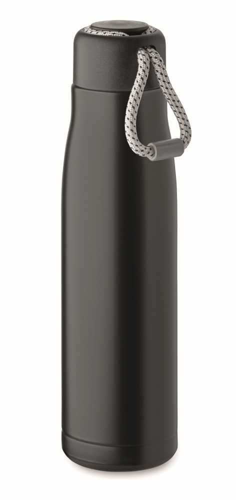 Dvoustěnná vakuová láhev z recyklované nerezové oceli (90 % recyklované nerezové oceli a 10 % nerezové oceli) s úchytem ze šňůrky na víčku z PP. Objem: 500 ml. Rozměry: O 6,5 x 25 cm