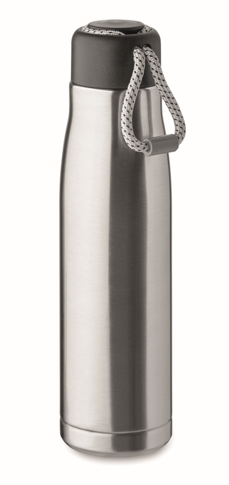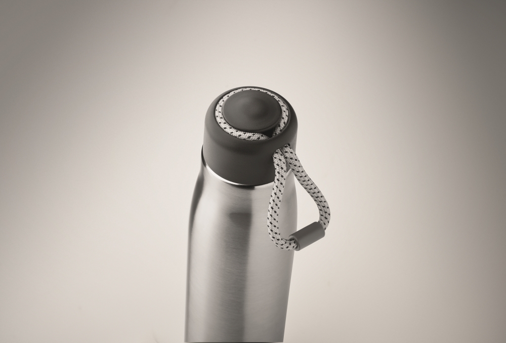 Dvoustěnná vakuová láhev z recyklované nerezové oceli (90 % recyklované nerezové oceli a 10 % nerezové oceli) s úchytem ze šňůrky na víčku z PP. Objem: 500 ml. Rozměry: O 6,5 x 25 cm