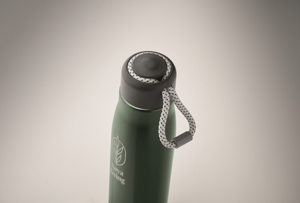 Dvoustěnná vakuová láhev z recyklované nerezové oceli (90 % recyklované nerezové oceli a 10 % nerezové oceli) s úchytem ze šňůrky na víčku z PP. Objem: 500 ml. Rozměry: O 6,5 x 25 cm