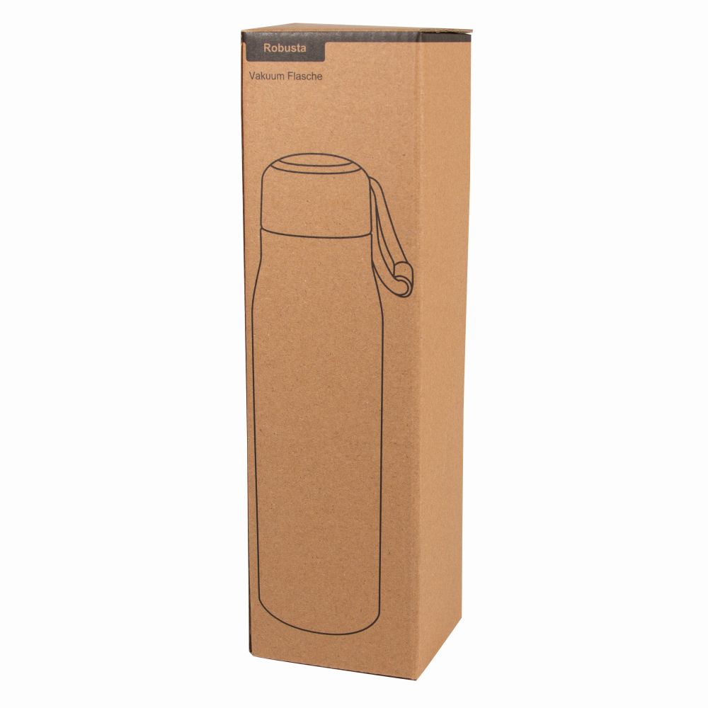 Dvoustěnná termoska z nerezové oceli s černým šroubovacím víčkem a poutkem, objem 500 ml. Teplotu horkého nápoje udrží cca 8 hodin a teplotu studeného nápoje cca 12 hodin. Rozměry: O 7 × 26 cm.