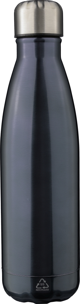 Recyklovaná dvoustěnná lahev z nerezové oceli (500 ml) se šroubovacím uzávěrem. Interiér je vyroben z nerezové oceli 304 a exteriér je z nerezové oceli 201. Recyklované logo vyryté na láhvi. Jednotlivě baleno v hnědé kartonové krabici.Rozměry: 7 x 25,7 cm