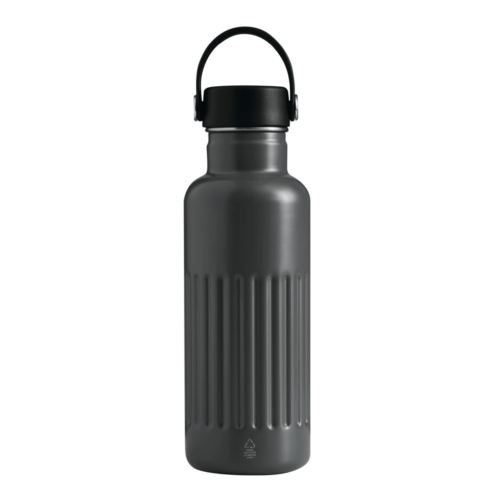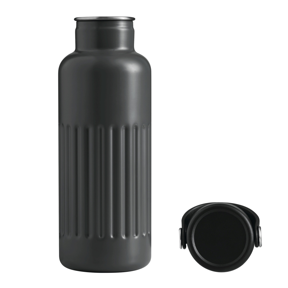 Dvoustěná vakuová láhev na pití, vnitřek z recyklované nerezové oceli, vnější strana z nerezové oceli, víčko s bezpečným šroubovacím uzávěrem, silikonovým těsněním a plastovým popruhem na přenášení, objem cca 500 ml, udrží nápoj teplý cca 8 hodin a studený až 12 hodin, baleno v krabičce. Rozměry: O7 x 22,5 cm