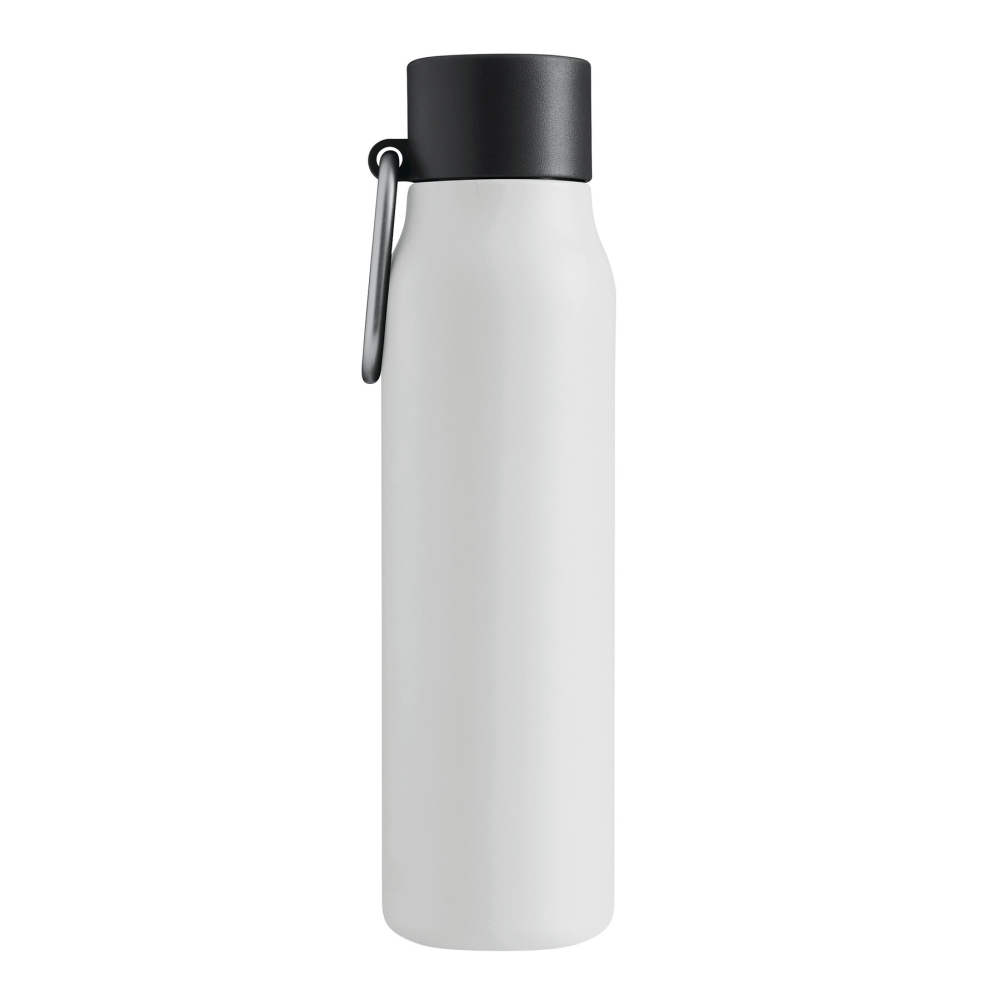 Dvoustěnná vakuová láhev na pití, vnitřek z recyklované nerezové oceli, vnější strana z nerezové oceli, plastové víčko s bezpečným šroubovacím uzávěrem, silikonovým těsněním a karabinou (karabina NENÍ vhodná pro lezení), objem cca 550 ml, udrží teplé nápoje cca 8 hodin a studenoé až 12 hodin, baleno v krabičce. Rozměry: O6,5 x 25 cm