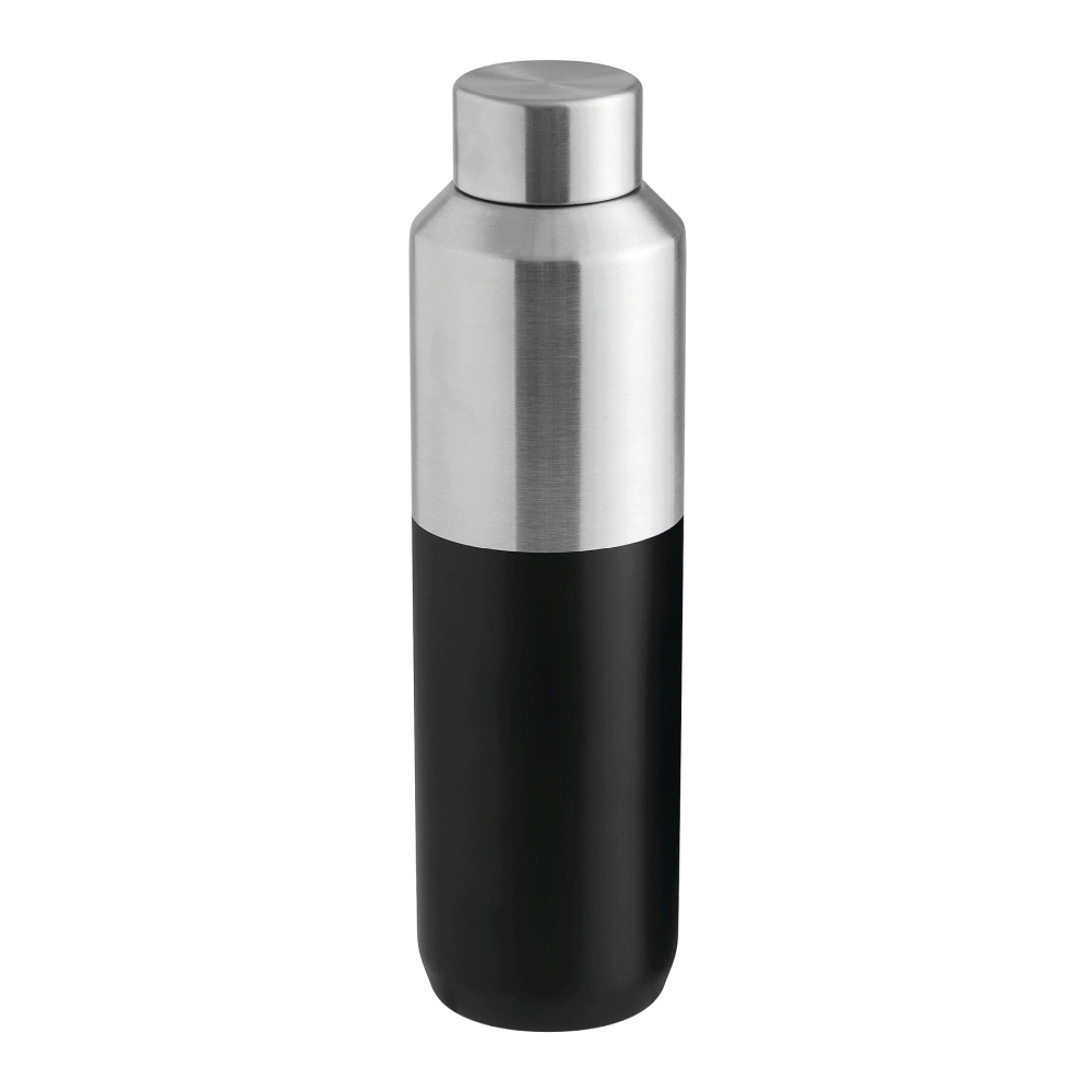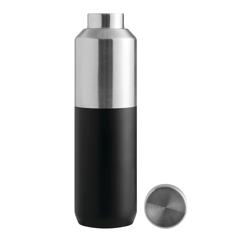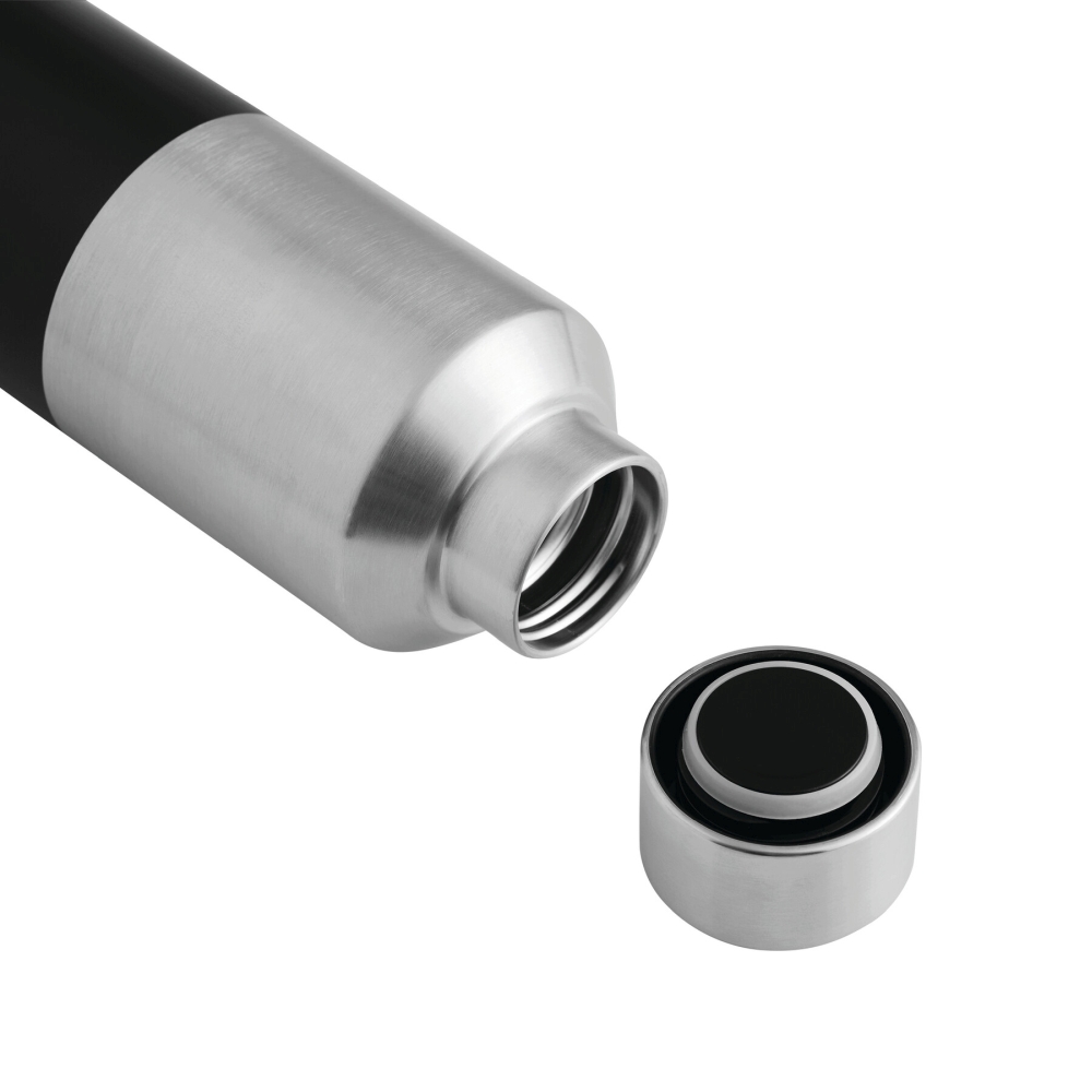 Dvoustěnná vakuová láhev na pití, vnitřek z recyklované nerezové oceli, vnější strana z nerezové oceli, víčko s bezpečným šroubovacím uzávěrem a silikonovým těsněním, objem cca 600 ml, udrží teplé nápoje cca 8 hodin a studenoé až 12 hodin, baleno v krabičce. Rozměry: O7 x 24,5 cm