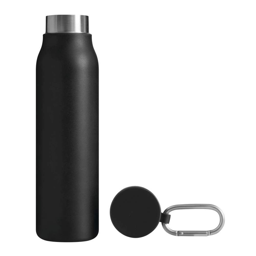 Dvoustěnná vakuová láhev na pití, vnitřek z recyklované nerezové oceli, vnější strana z nerezové oceli, plastové víčko s bezpečným šroubovacím uzávěrem, silikonovým těsněním a karabinou (karabina NENÍ vhodná pro lezení), objem cca 550 ml, udrží teplé nápoje cca 8 hodin a studenoé až 12 hodin, baleno v krabičce. Rozměry: O6,5 x 25 cm