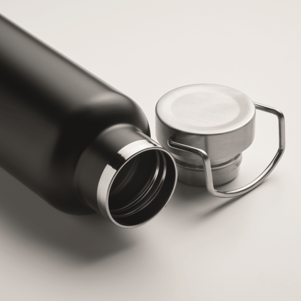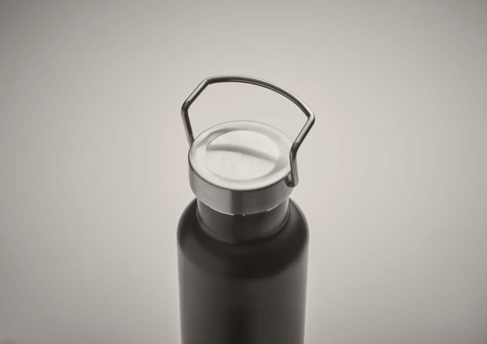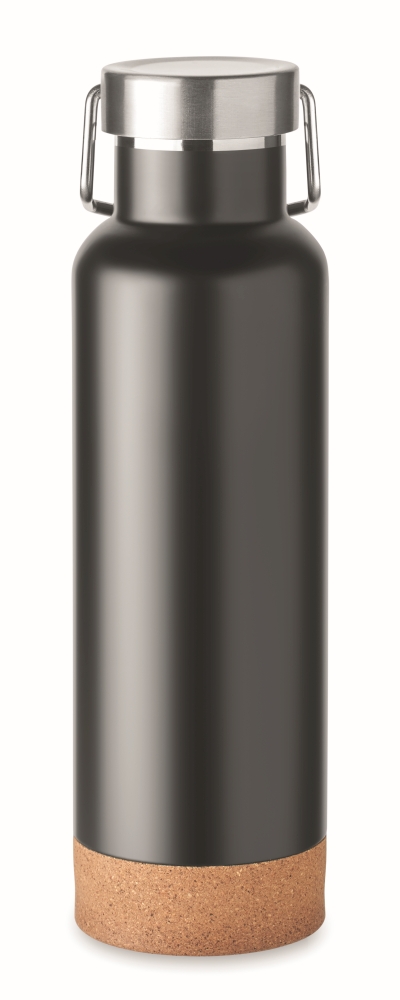 Dvojstěnná vakuově izolovaná láhev z recyklované nerezové oceli s víčkem s držátkem a korkovým detailem dna. Objem: 500 ml. (90 % recyklované nerezové oceli a 10 % nerezové oceli). Rozměry: O7 x 24 cm. Materiál: nerezová ocel