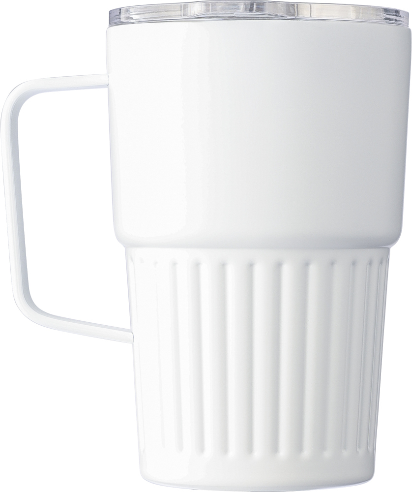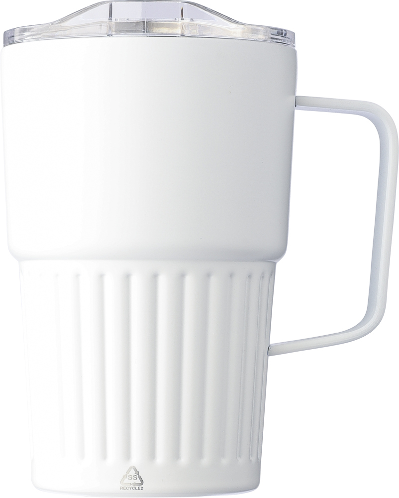 Dvoustěnný hrnek z recyklované nerezové oceli (450 ml). S vroubkovanou robustní rukojetí. S víkem AS s posuvným uzávěrem. Na těle je vyryté recyklované logo. Jednotlivě baleno v hnědé kartonové krabici. Rozměry: 8,7 x 14 cm