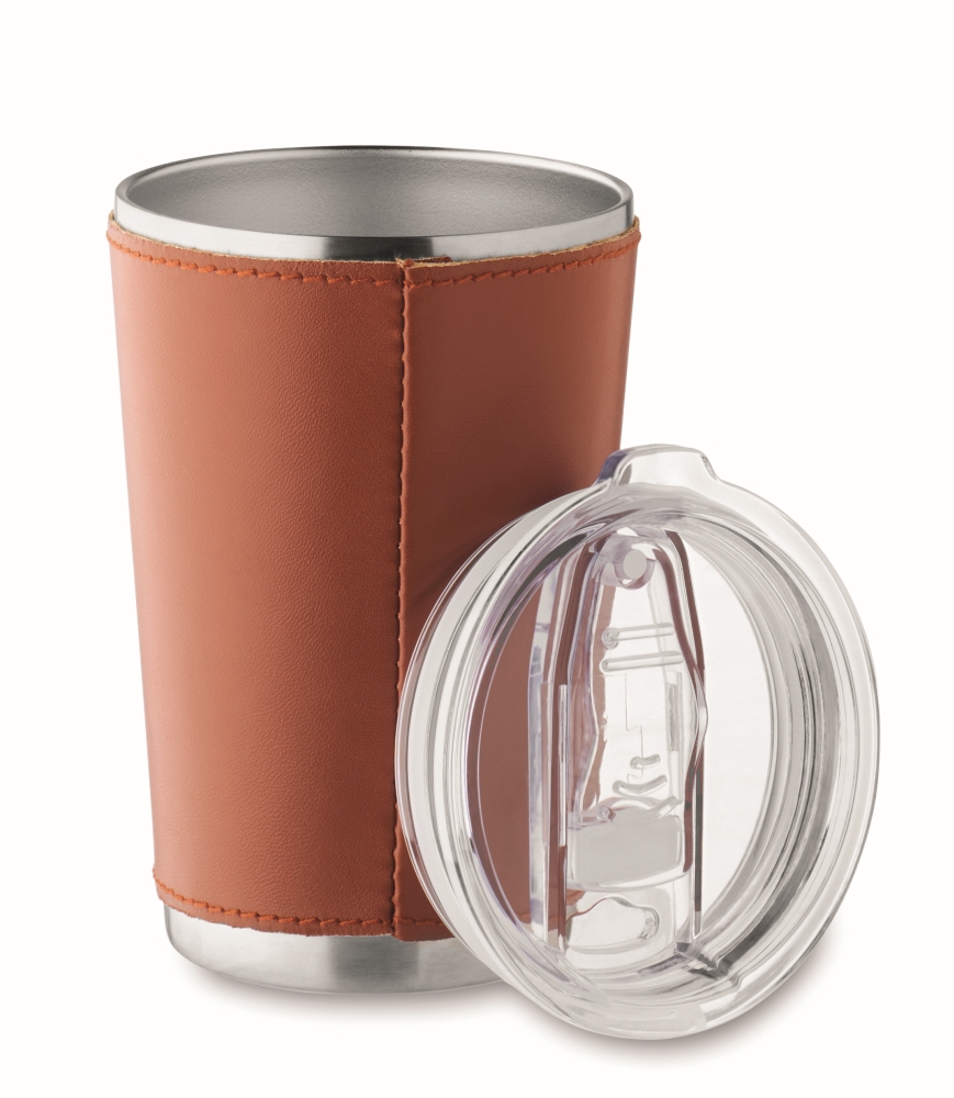 Dvoustěnný pohárek z recyklované nerezové oceli (90 % recyklovaná nerezová ocel a 10 % nerezová ocel) s odnímatelným návlekem z PU kůže. Víčko s posuvným otvorem na pití. Objem: 350 ml. Rozměry: O 8,5 x 12,5 cm