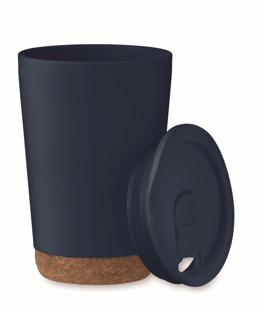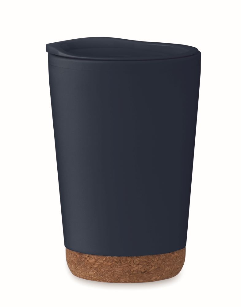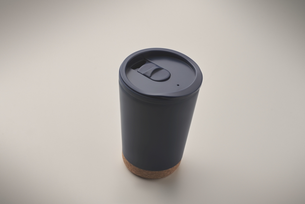 Dvoustěnný pohárek z PP s korkovým dnem a posuvným uzavíracím víčkem s náustkem z PS a ABS. Objem: 300 ml. Rozměry: O 8 x 12 cm