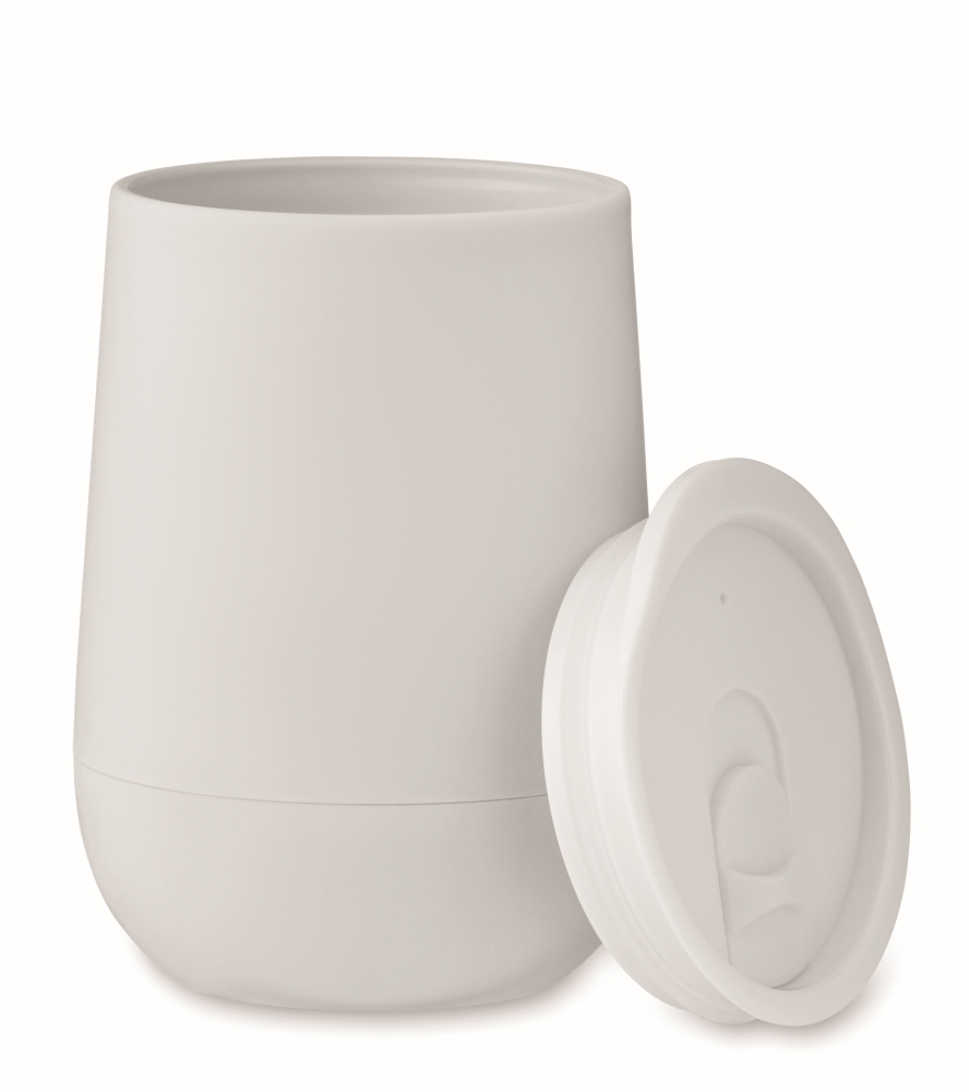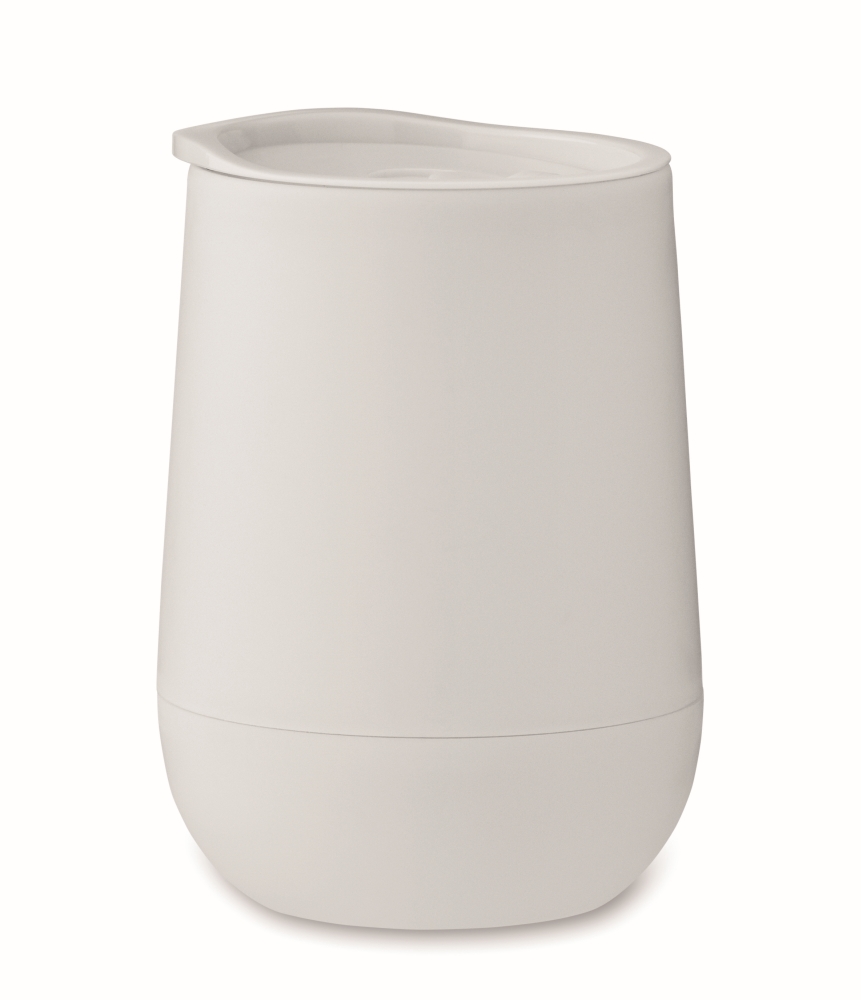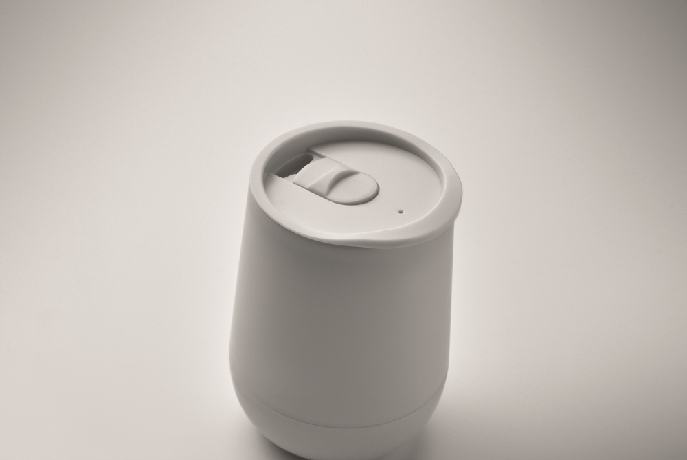 Dvoustěnný pohárek z PP s víčkem s posuvným zavíráním. Materiál víčka PS a ABS. Objem: 300 ml. Rozměry: O 8 x 12 cm