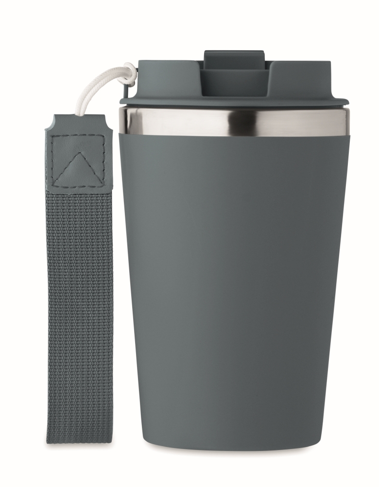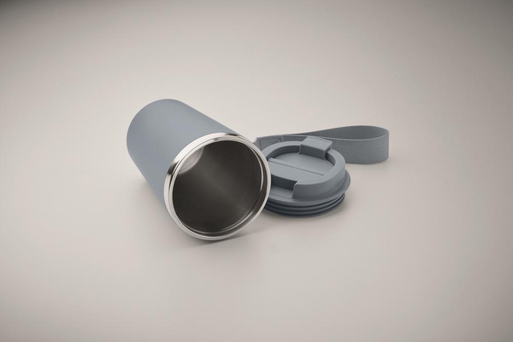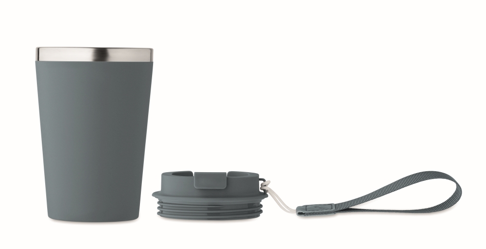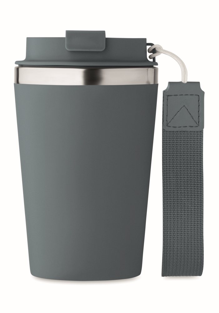 Dvoustěnný termohrnek z recyklované nerezové oceli (90 % recyklovaná nerezová ocel a 10 % nerezová ocel) s vnější vrstvou z recyklovaného PP a RPET poutkem na zápěstí. Objem: 350 ml. Rozměry: O 8,5 x 14 cm. Materiál: recyklovaný PP