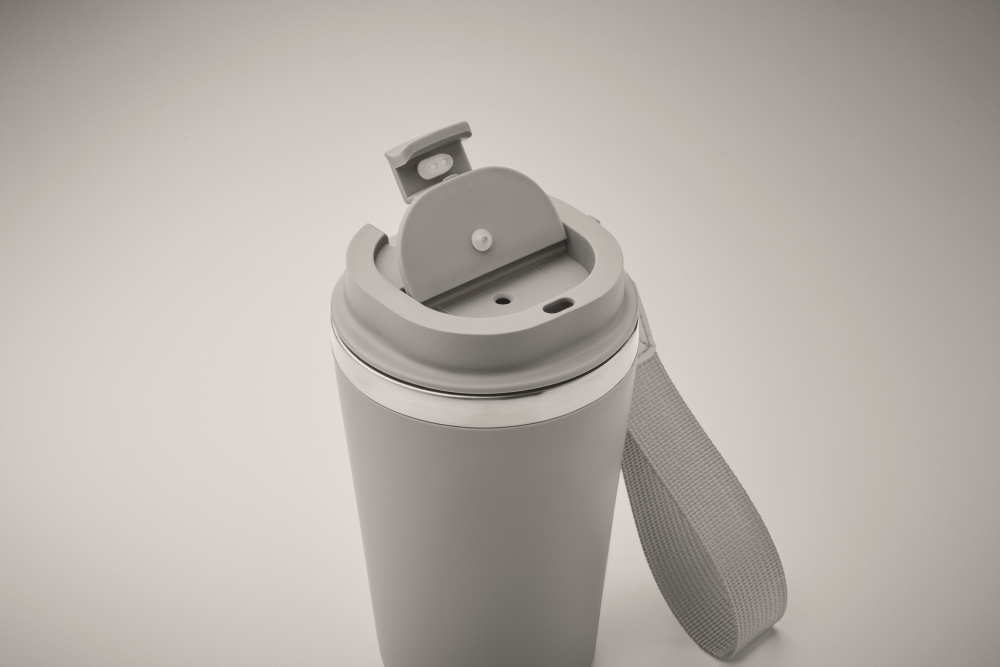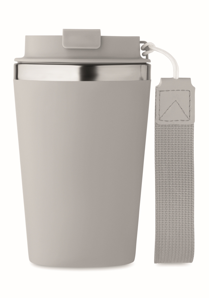Dvoustěnný termohrnek z recyklované nerezové oceli (90 % recyklovaná nerezová ocel a 10 % nerezová ocel) s vnější vrstvou z recyklovaného PP a RPET poutkem na zápěstí. Objem: 350 ml. Rozměry: O 8,5 x 14 cm. Materiál: recyklovaný PP