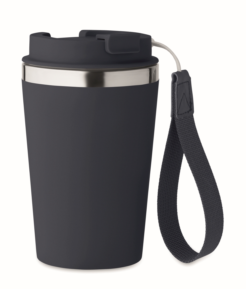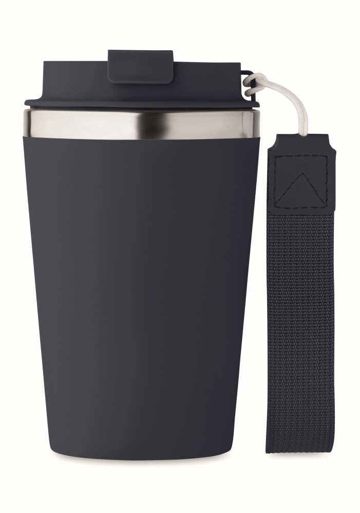 Dvoustěnný termohrnek z recyklované nerezové oceli (90 % recyklovaná nerezová ocel a 10 % nerezová ocel) s vnější vrstvou z recyklovaného PP a RPET poutkem na zápěstí. Objem: 350 ml. Rozměry: O 8,5 x 14 cm. Materiál: recyklovaný PP