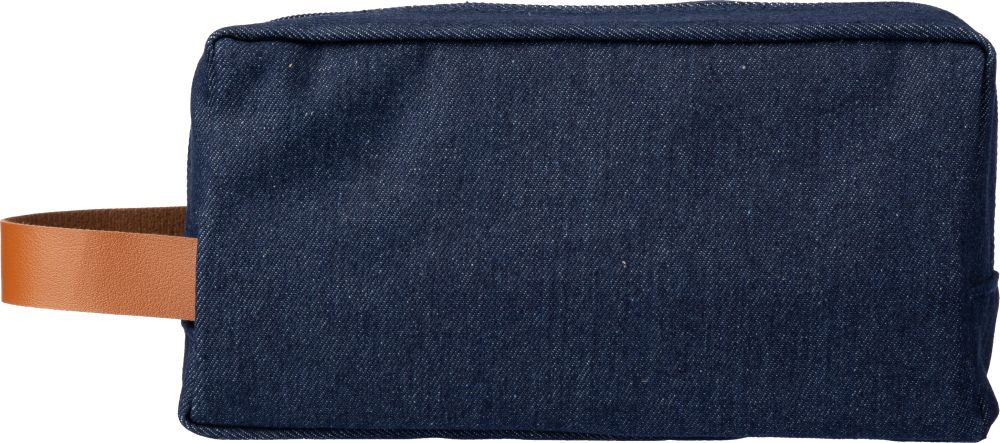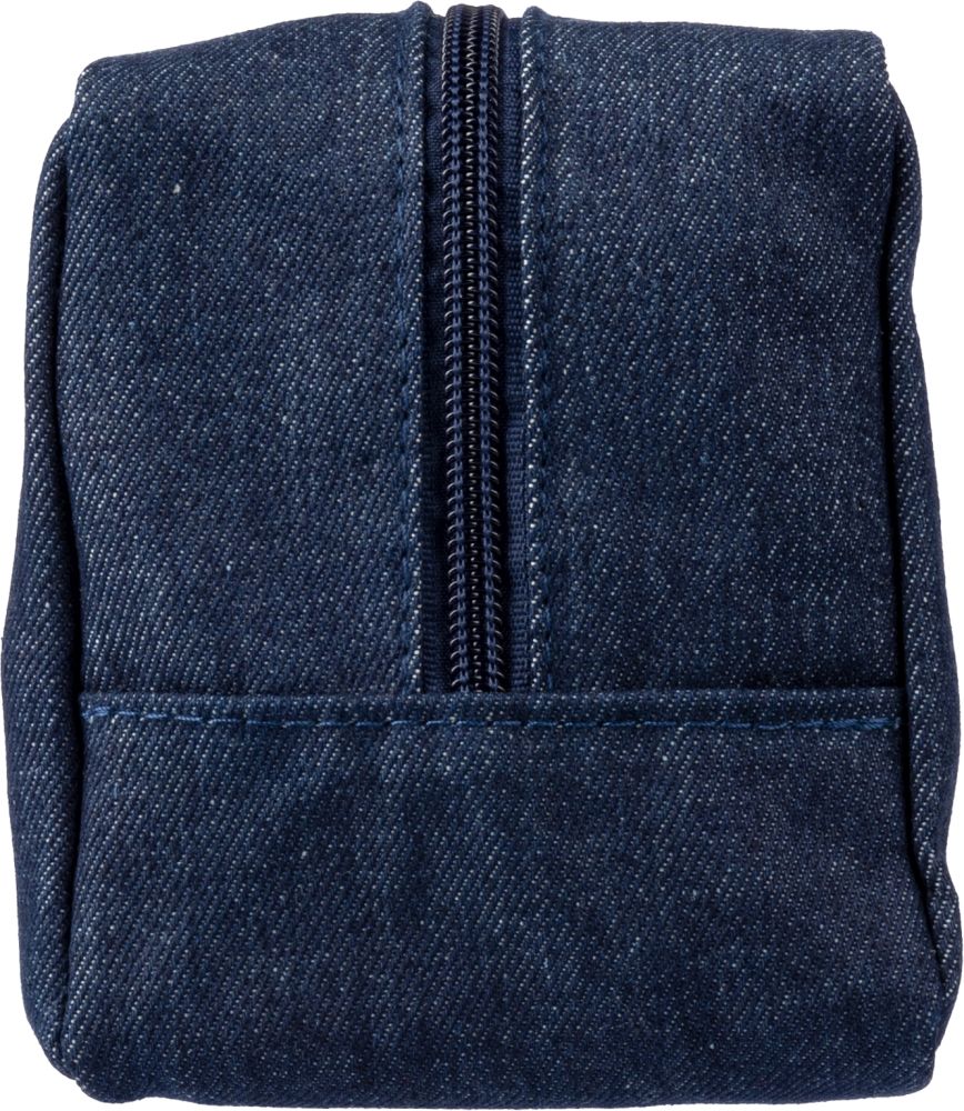 Džínová kosmetická taštička s PU detaily a zipem. Krátké rukojeti pro přenášení. Materiál: džínovina Rozměry: 22,5 x 9,5 x 11 cm