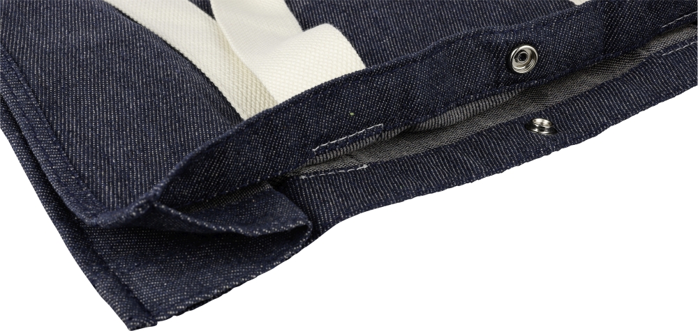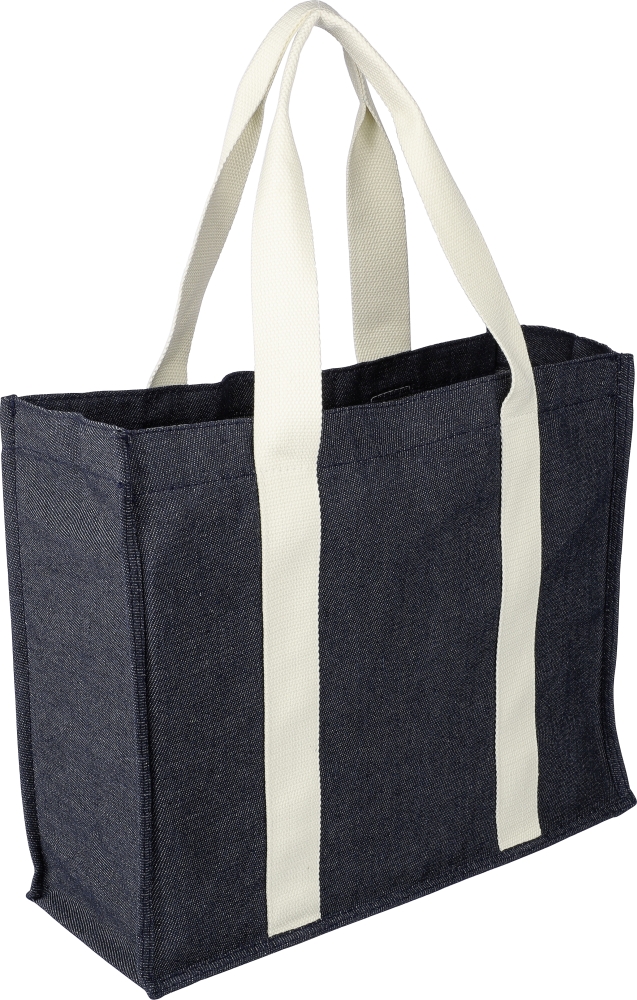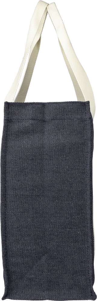 Džínová (280 g/m2) nákupní taška s 15centimetrovými klíny a dlouhými plátěnými (280 gsm) uchy. Džínovina je vyrobena z 65% polyesteru a 35% bavlny. Obsahuje jedno tlačítko pro uzavření tašky. Stálobarevnost džínoviny je až 2-3 úrovně.Rozměry: 33 x 39 x 15 cm