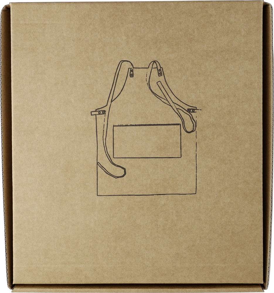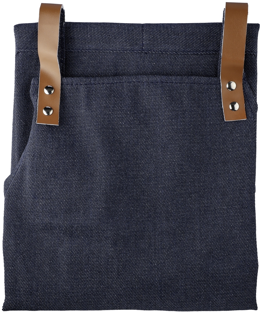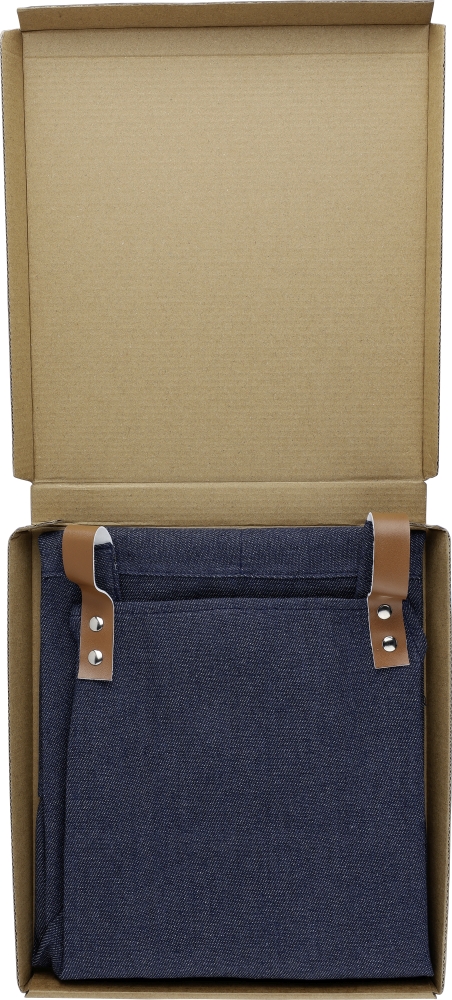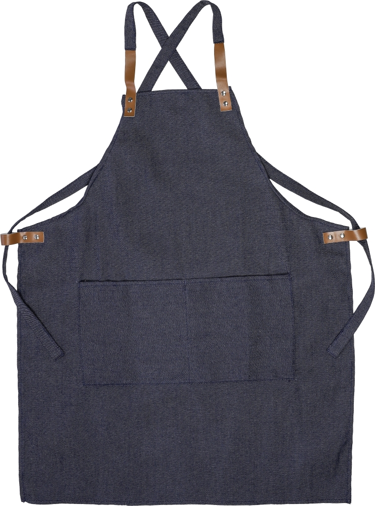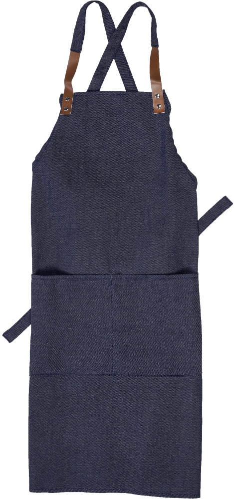 Džínová (280 g/m2) zástěra s ramenními popruhy a dvěma předními kapsami. Džínovina je vyrobena z 65% polyesteru a 35% bavlny. Tato zástěra nemá popruh na krk, pouze ramenní popruhy. Stálobarevnost džínoviny je až 2-3 úrovně. Jednotlivě balené v hnědé kartonové dárkové krabičce.Rozměry: 68 x 88 x 88 cm