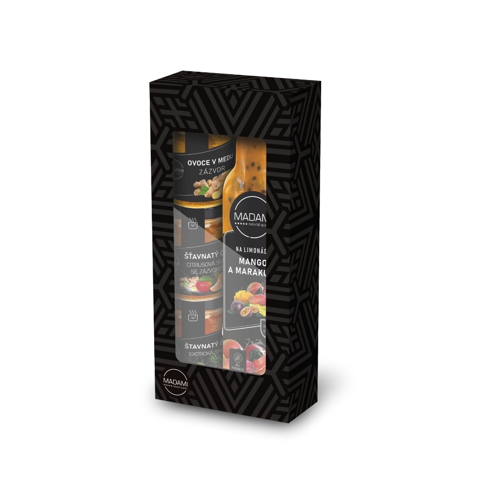 Dárková sada obsahuje šťavnatý čaj Tropické ovoce a zázvor 55 g, šťavnatý čaj Exotická směs 55 g, zázvor v medu 68 g a Ovoce na limonádu Mango a Marakuja 0,25 l. Termín dodání: 10 dnů. Rozměry: 22 × 10 × 5 cm.