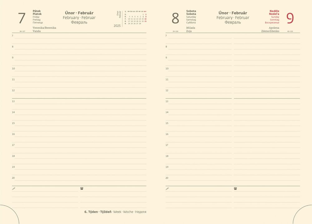 Kalendárium: denní. Rozměry: 14,3 x 20,5 cm.