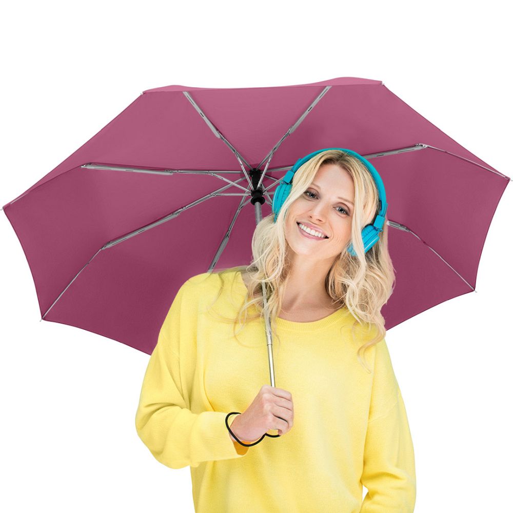Malý skládací deštník s kovovou konstrukcí, odolný proti větru, automatický systém open–close, polyester pongee. Rozměry: O 97 cm, ve složeném stavu 28 cm.