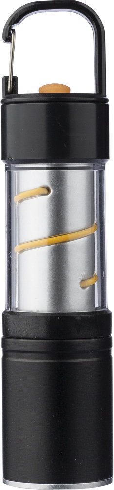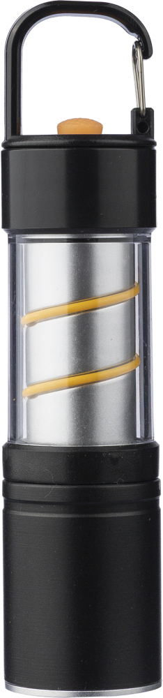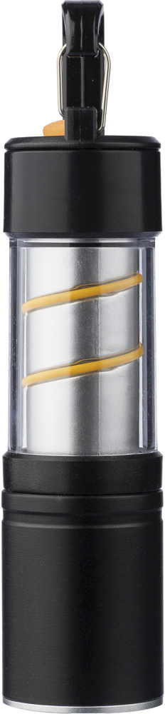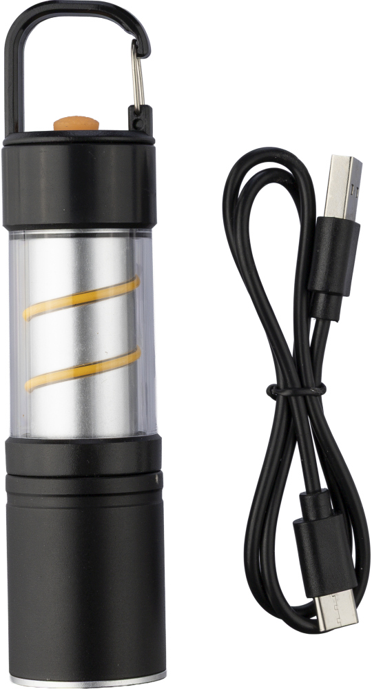 Hliníková a slitinová COB svítilna s ABS pouzdrem a kovovým klipem na zadní straně. Nabízí 3 světelné funkce, režim zoomu a černou karabinu na horní straně. Napájena lithium-iontovou baterií s kapacitou 14 500–500 mAh s nabíjením přes konektor typu C. Poskytuje 130 lumenů a obsahuje 30cm černý kabel. Ovládání tlačítkem a magnetická základna. Jednotlivě baleno v hnědé kartonové krabici. Rozměry: 3 x 3 x 13 cm