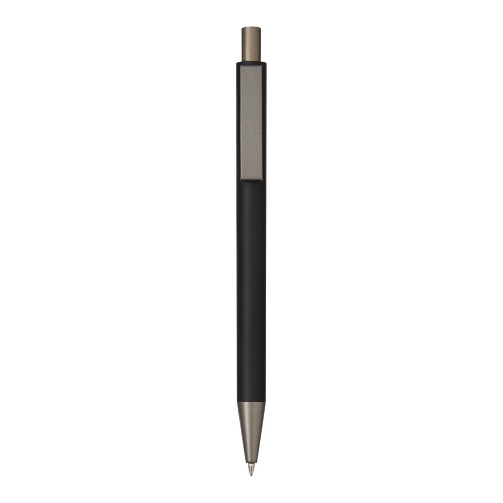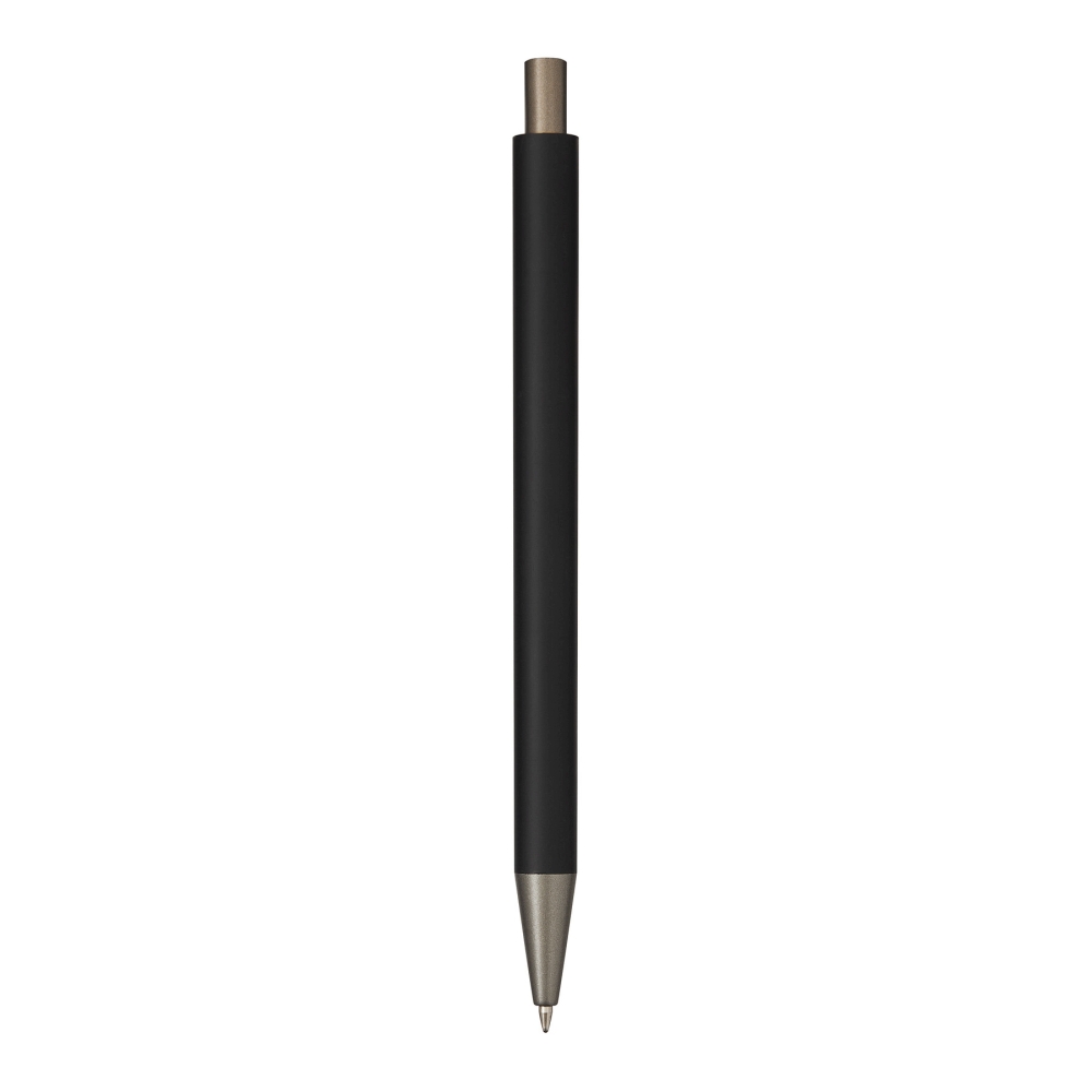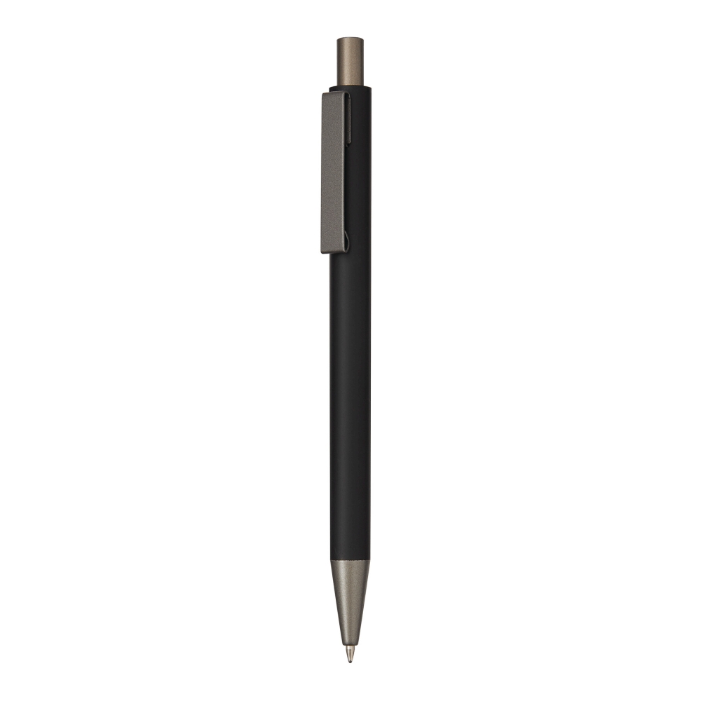 Hliníková propiska, matný kovový plášť, tlačítkový mechanismus, velká náplň, modrý inkoust. Rozměry: 14,2 cm