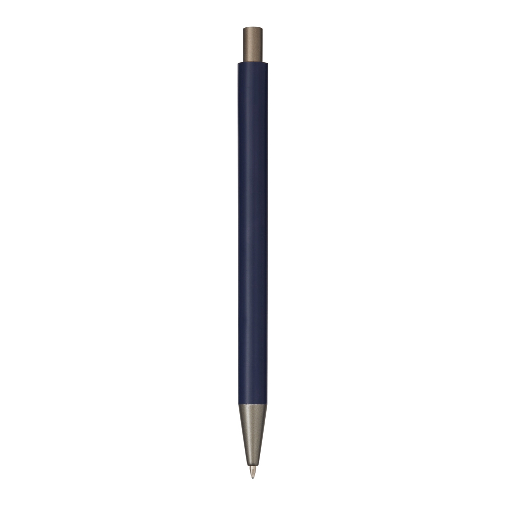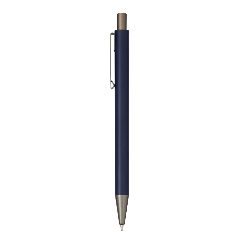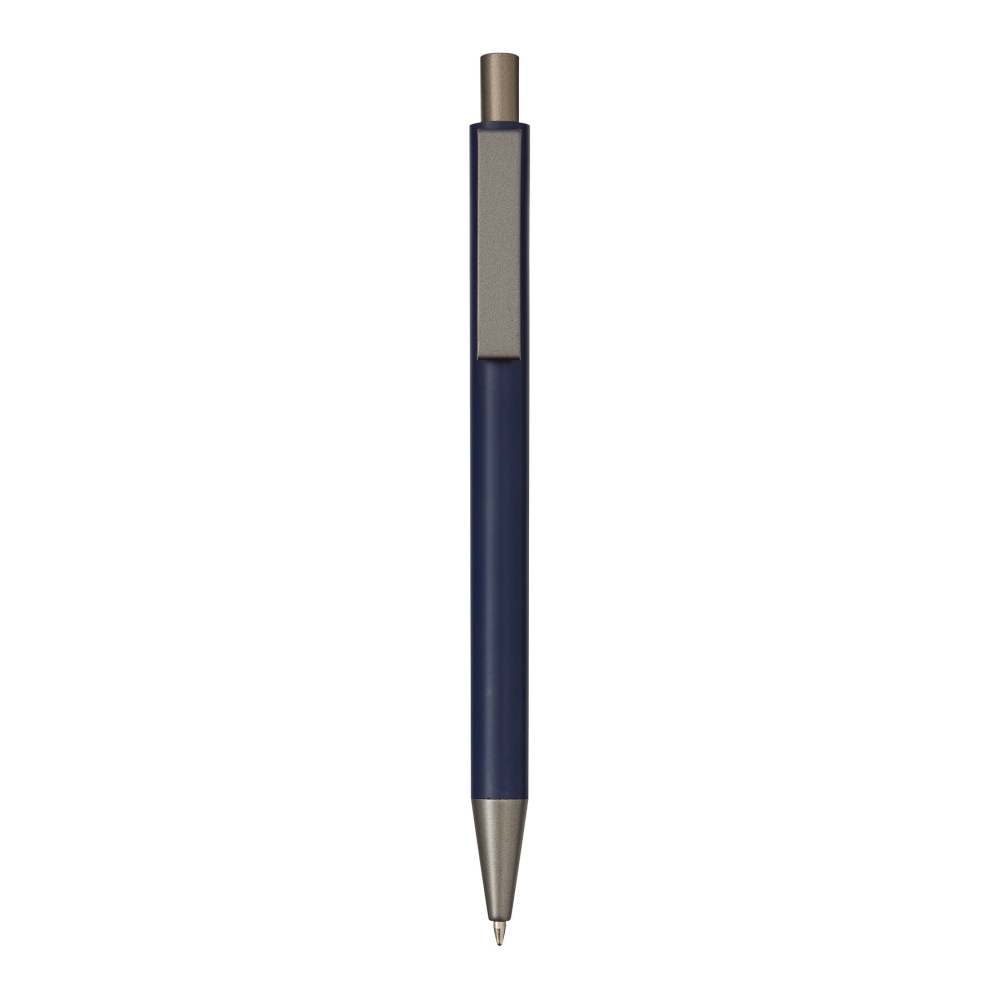 Hliníková propiska, matný kovový plášť, tlačítkový mechanismus, velká náplň, modrý inkoust. Rozměry: 14,2 cm